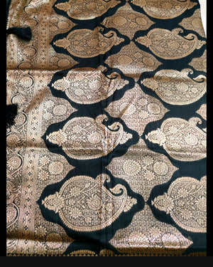 Design: Intricately woven Banarasi pattern with elegant tassels on the pallu