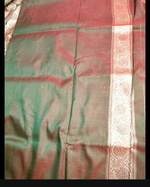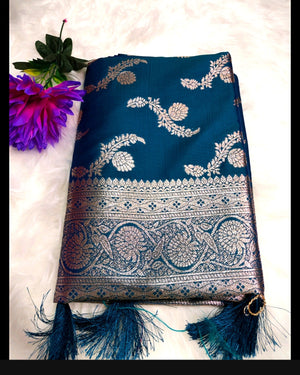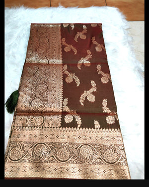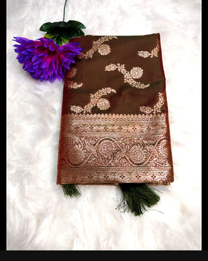 Indulge in timeless grace with our Banarasi Chiffon Tissue Soft Silk Saree, beautifully woven. This saree blends the luxurious charm of Banarasi craftsmanship with the delicate drape of soft silk, making it perfect for festive occasions and celebrations.
